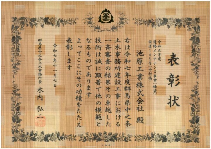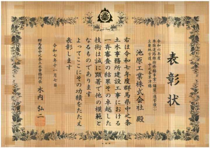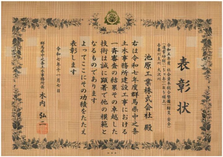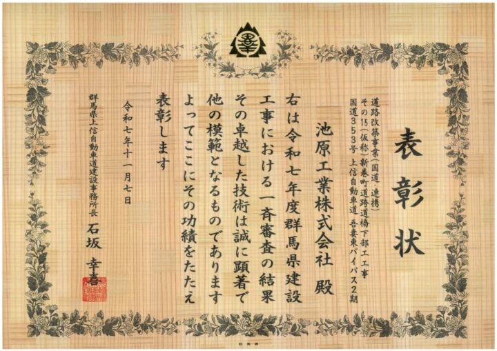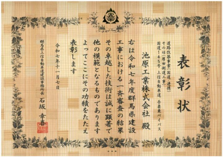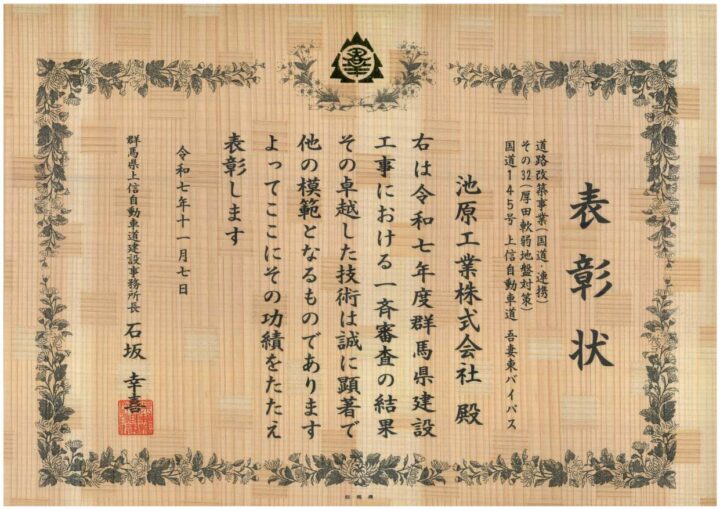 今後も地域の発展に貢献できるよう、社員一同さらなる技術の研鑽と安全管理の徹底に努めてまいります。(弊社ホームページの「事業案内」ページ下段にて、令和7年度に受賞した表彰工事一覧をご覧いただけます。)